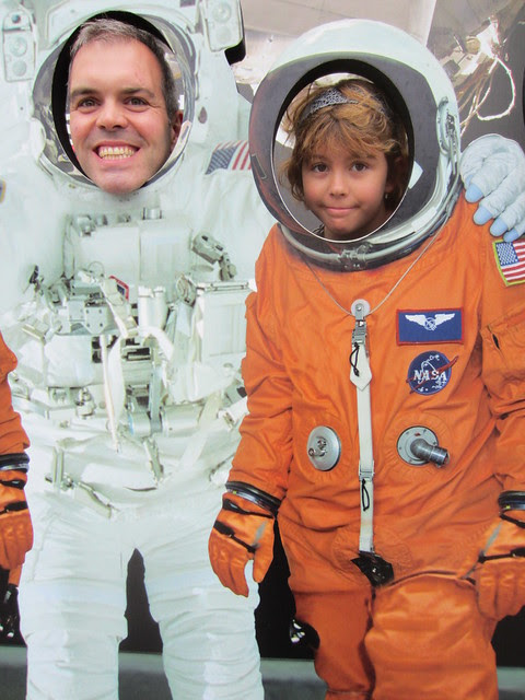 This is Eryn with a fake astronaut. He's giving her the thumbs up because she passed inspection at the metal detector. I'm not sure what they were so worried we'd bring into the area. Perhaps it's because after that checkpoint it was possible to get on a bus and go to the staging and launch areas. The guard at the metal detector was very nice and gave Eryn a few photos - not prints, photos - of the last shuttle launch.