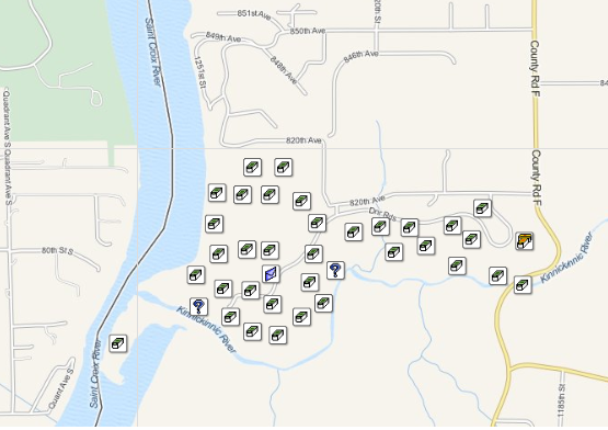 I had Friday off to make up the holiday I never took, so The Boss and I went caching at Kinnickinnic State Park near Prescott Wisconsin. I believe we found either 35 or 36 caches - I haven't tallied them all up yet. Basically everything you can see in this picture, including the multicache and the two mystery caches, and the letterboxing cache. Just not that one that's across the St. Croix River out on the peninsula. See it - right out there - that one on the dingle. That one is probably for boaters, not your casual walking around in the woods cachers. The multicache was interesting. We spent quite a while poking around with the phone in the first stage trying to figure out what to do, only to realize after about five minutes that we weren't supposed to be looking IN the phone, but at the number pad. Duh. It was a good multicache, as we didn't have to travel far away to find the second stage. It's also about the only cache I didn't take a picture of with my phone. I'll post some more pictures tomorrow, but below is a nice panorama of a few of the interesting bits.