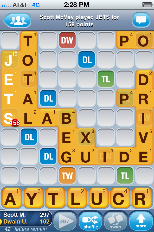 I have a lot of time for Words With Friends and Draw Something while cooped up in the basement. Kristine and Klund's wife both tend to crush me. But I do ok against Klund himself and Dwain. Maybe it's how women think that I can't compete with. It didn't help Dwain that I was just biding my time for the perfect place to play my JO and he provided it. Bad thing about Words With Friends, in my opinion, is that one minimalist placement can determine the whole game. Particularly when it's a 158 point placement.
