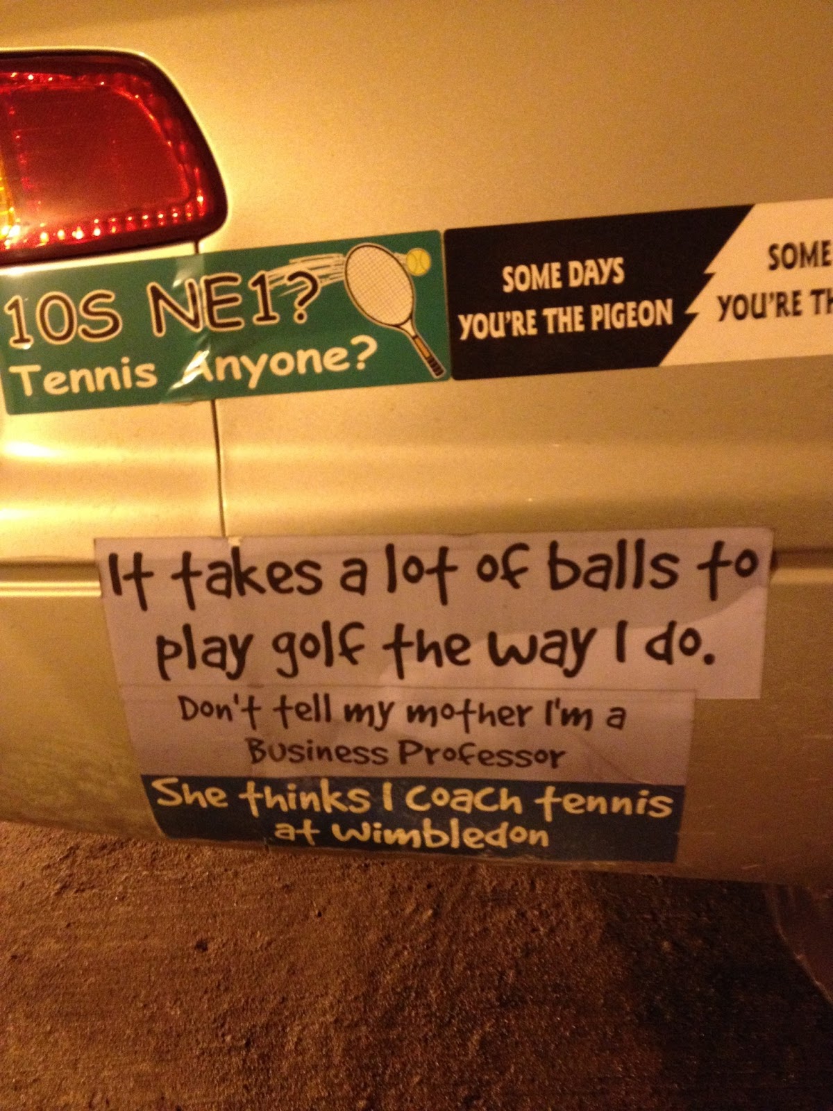 We ended up parked next to this car in a downtown ramp. I don't understand the "She thinks I coach tennis at Wimbledon" one at all. Is the implication he's pulling the wool over someone's eyes, and that's to be lauded? Is some guy from Minnesota trolling tennis courts with a shitty faux-English accent? At least the lot of balls one makes sense, even if it's stupid. That one even gets its own song. Popular enough to get more than one YouTube video! I'm going to add that this individual is a business professor to my list of reasons not to get an MBA.