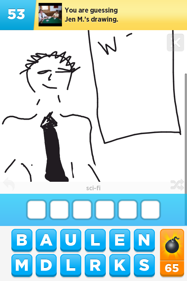 My wife drew me this picture in Draw Something. While not as terrifying as Ming's Milkman, I'm still very glad she didn't make his tie pink, because even in black, I wasn't sure during the drawing process what I was being led toward as a guess. I thought about just cutting it out with Paint so you could appreciate Fox Mulder's "tie" all by itself, but I don't want to get tagged as a porn site. In real life, he has a teapot to cover that thing up.