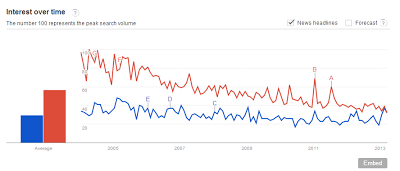 Apparently both my wife and I are trending downward on the web, but she's trended down significantly more since marrying me, until it looks like I may finally pass her in popularity. Another 20 years of marriage, and she's going to go below the base line at this rate.