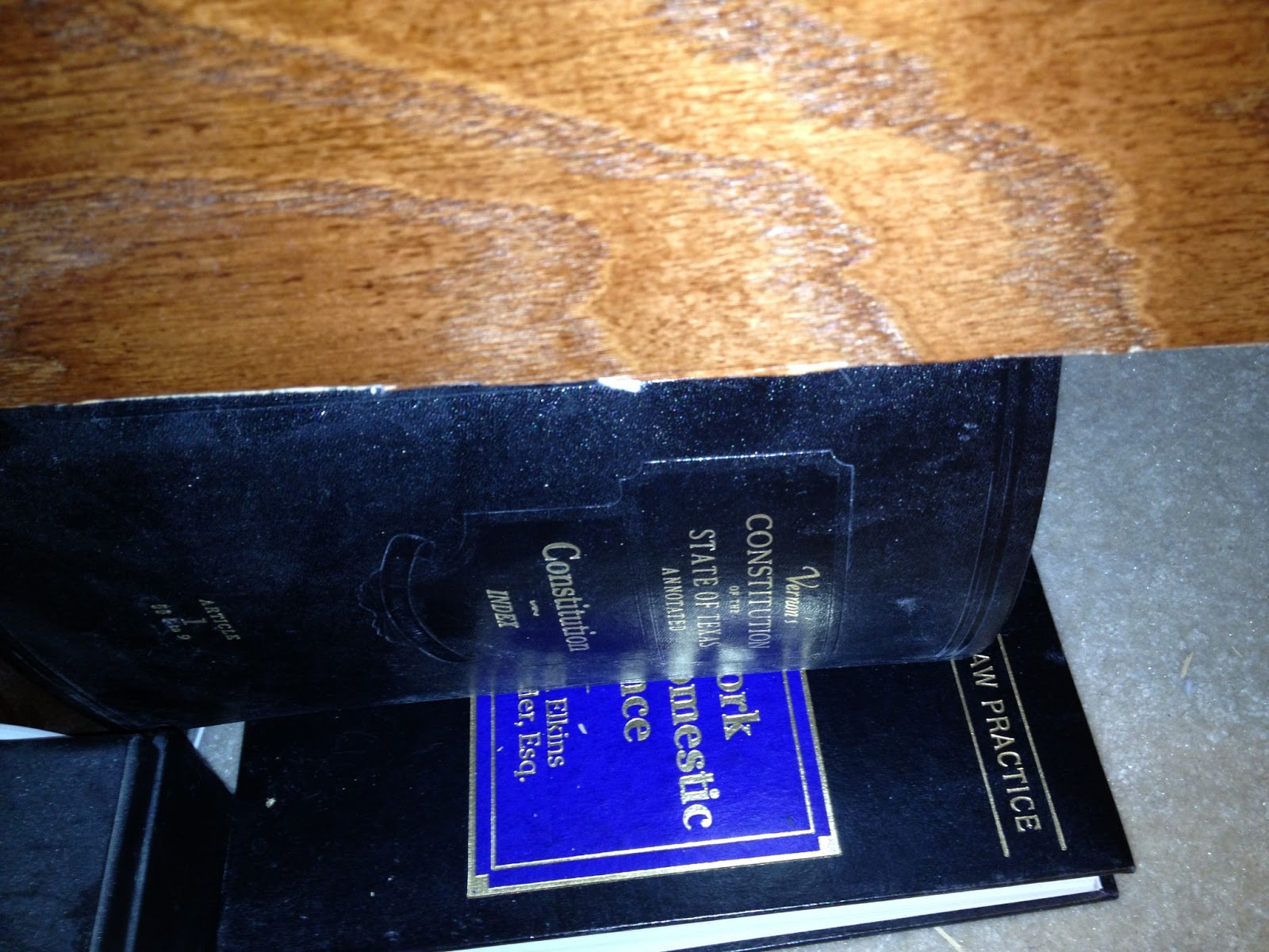 I have found a brand new use for the old corporate books that I had on my bookshelf, awaiting modification for use as hidden storage presents. The bed frame where the inner portion of the frame attaches to the support for the mattress is in part glued in place, and the glue has dried out and the wood popped loose. Go ahead and make jokes about a.) the glue drying up like my marriage, 2.) the glue being as old as I am, 3.) blue humor of sundry sorts. I'm more concerned that it doesn't appear as though anyone has cleaned under the bed since Eryn was born and I'm worried what might be living in the dust and what I breathed into my lungs. And the combination of the popped frame and trying to lift the mattress set while I shove books under there with what might be a bruised bone or slight fracture has made me a bit cranky and in need of another Aleve. In case you can't read them, I'm currently doing home repair using the Constitution of the State of Texas and a tome on Domestic Violence.