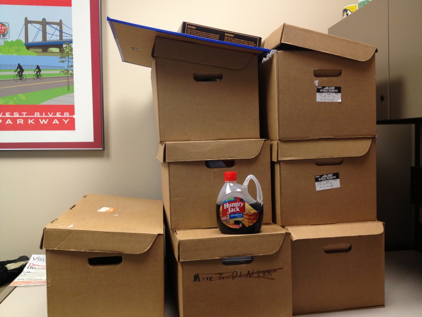 Here's my packing job. I considered reviewing what I packed - I think some of it is just there to remind me to update my resume as it includes historic files from up to 13 years ago, things I can't even remember I once did - but I'll do that on the unload. The syrup is being kept separate because I don't want to have to clean a box full of syrup. I could put it in the box that's full of napkins, cups, bowls, plates, and plasticware, but I know if it spilled, the whole box would just go to the trash.