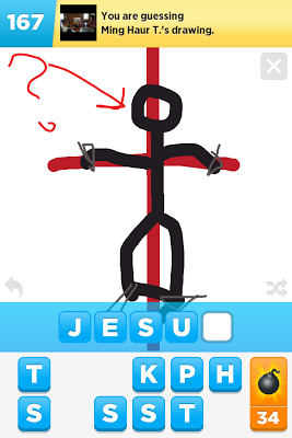 Is that sacrilegious? Probably. I don't think Jesus would mind. The M stands for Ming. Because he drew this stick figure Jesus. I was disappointed by the lack of a thorny crown and the spear piercing his side and by the lack of the other two on the mount. But brevity worked in this case. Still, it's not as good as his Milkman.