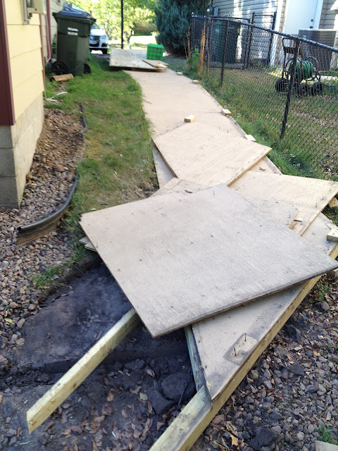 You can see the dirt that's under the 4x8s in the above picture. I'm using the recycling bin from a generation ago in Eagan as a riser while I cut. I have the boards face down so some poor kid or dog doesn't take a nail to the foot, but I flip them over to cut so I don't take the circular saw to a nail.