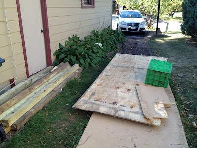 The ramp is coming down. Slowly, so I can dispose of it in a cheap manner. I'd rather spend my money on a circular saw than on a dumpster bag. So I'm prying it all up and cutting it all into bite-sized pieces. The 4x4s get set to the side for reuse. And the 2x4s, which have a lot of damage and nails are getting cleaned up and turned into a large Jenga set for when we have visitors. That, and a bit of it might be used for redoing the deck steps which are rotting away. These 4x8s are the target of the circular saw. I'd keep them, but they're in really rough shape after several months on the ground, and there's some mold and about 4 dozen nails (or nail holes) in each. I'd need a quarter of putty per board to reuse them for the shed.