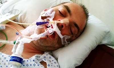 An awful close up picture. I'm more mortified about the baldness and chin rolls than I am the tubes and blood. I once read about a woman who started a business to make sure women with cancer could have makeup and other services, so they felt confident while locked up in a hospital bed. Found it...Look Good, Feel Better. Although I don't imagine there's anyway to prevent a certain slackness to the face laying on your back passed out and covered with a few days of stubble.