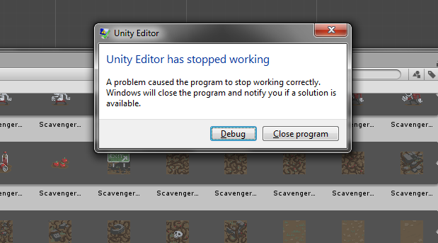 There's my Win32 meltdown that crashed Unity. I'm pretty sure it's because I made an instance of the prefab and then deleted the prefab in an attempt to make a new prefab. I can't be certain, but I suspect it's like having an instance of an object with no object? The important thing is not to do it - very messy.