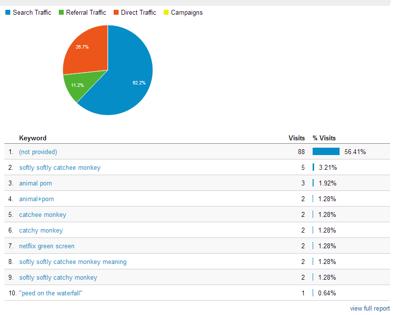 I hooked up Google Analytics finally. I find reviewing my search terms to be disturbing. Apparently I'm much more of a fetish website than I ever realized. "Peed on the Waterfall" is interesting, because Google considers "Peeing on the Waterfall" to be equivalent. Makes me wonder if they were really searching for something about agile (which is what my article is about) or something urological.