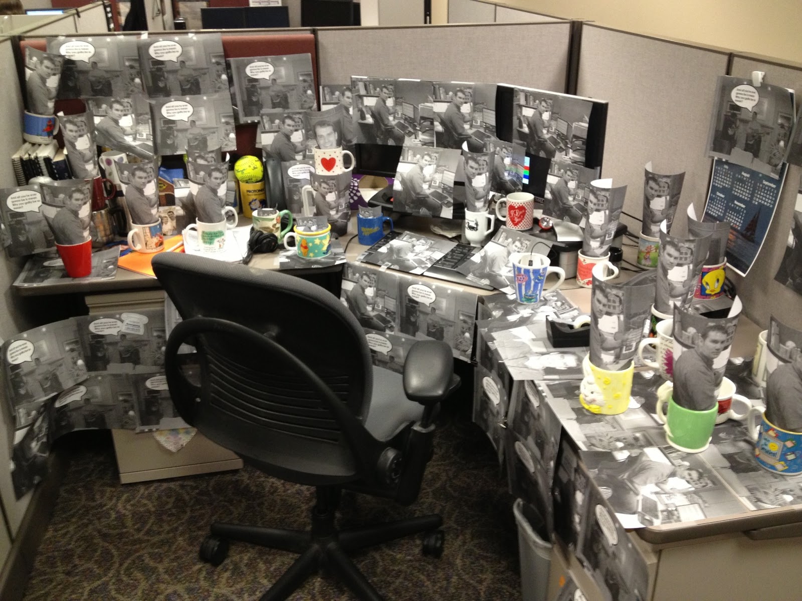 One of my coworkers recently moved closer to my office. And then immediately went on vacation. So while he was out of office, I spent a few minutes each day decorating his new cube with pictures of him, one of them singing a Taylor Swift song, and lots of strange mugs.