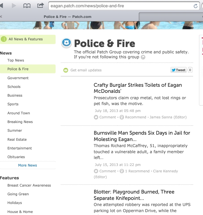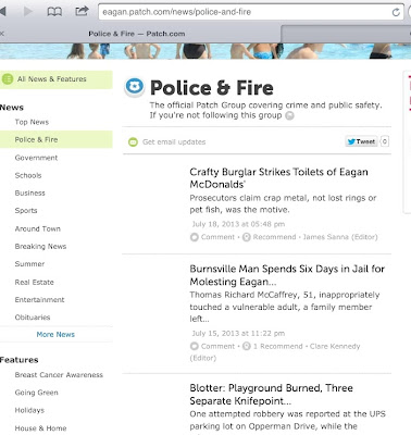 I like the first headline from The Patch, not because it's Crafty Burglar Strikes Toilets of Eagan McDonalds', but because the follow up line is "Prosecutors claim crap metal, not lost rings or pet fish, was the motive." I suppose that's accurate. And then to top it off, the next headline, "Burnsville Man Spends Six Days in Jail for Molesting Eagan..." is almost as funny, albeit sad. A poor choice of where to put the ... on the part of The Patch.